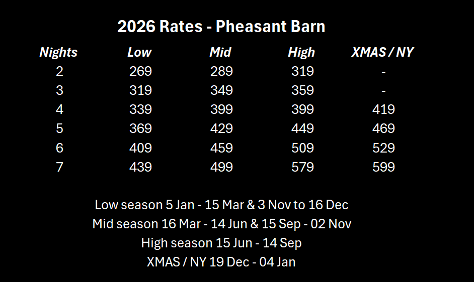sleeps 2 adults (Pheasant Barn is all on ground floor level)